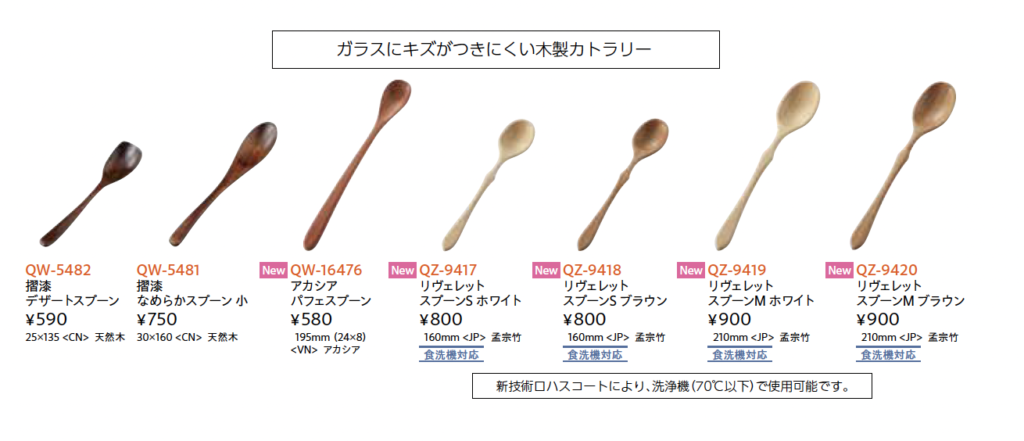 ガラス製品にキズがつきにくい、木製のカトラリー。