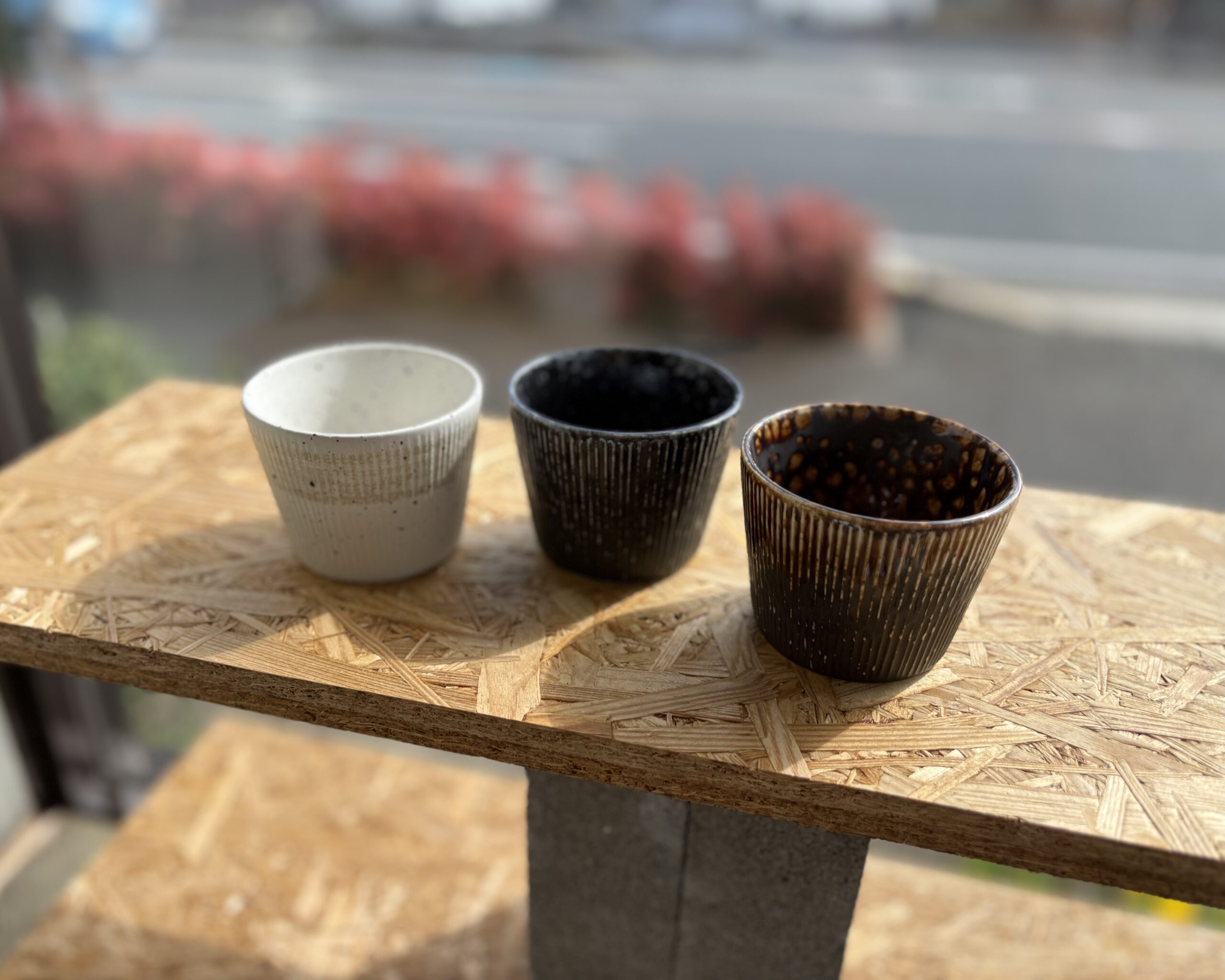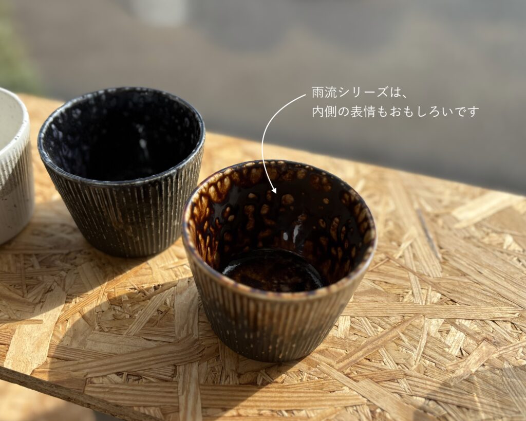 森の樹々を伝い落ちる雨粒の流れをイメージしてつくられた「雨流うりゅう」シリーズと、白御影石をイメージしてつくられた「白御影白刷毛」シリーズ。
